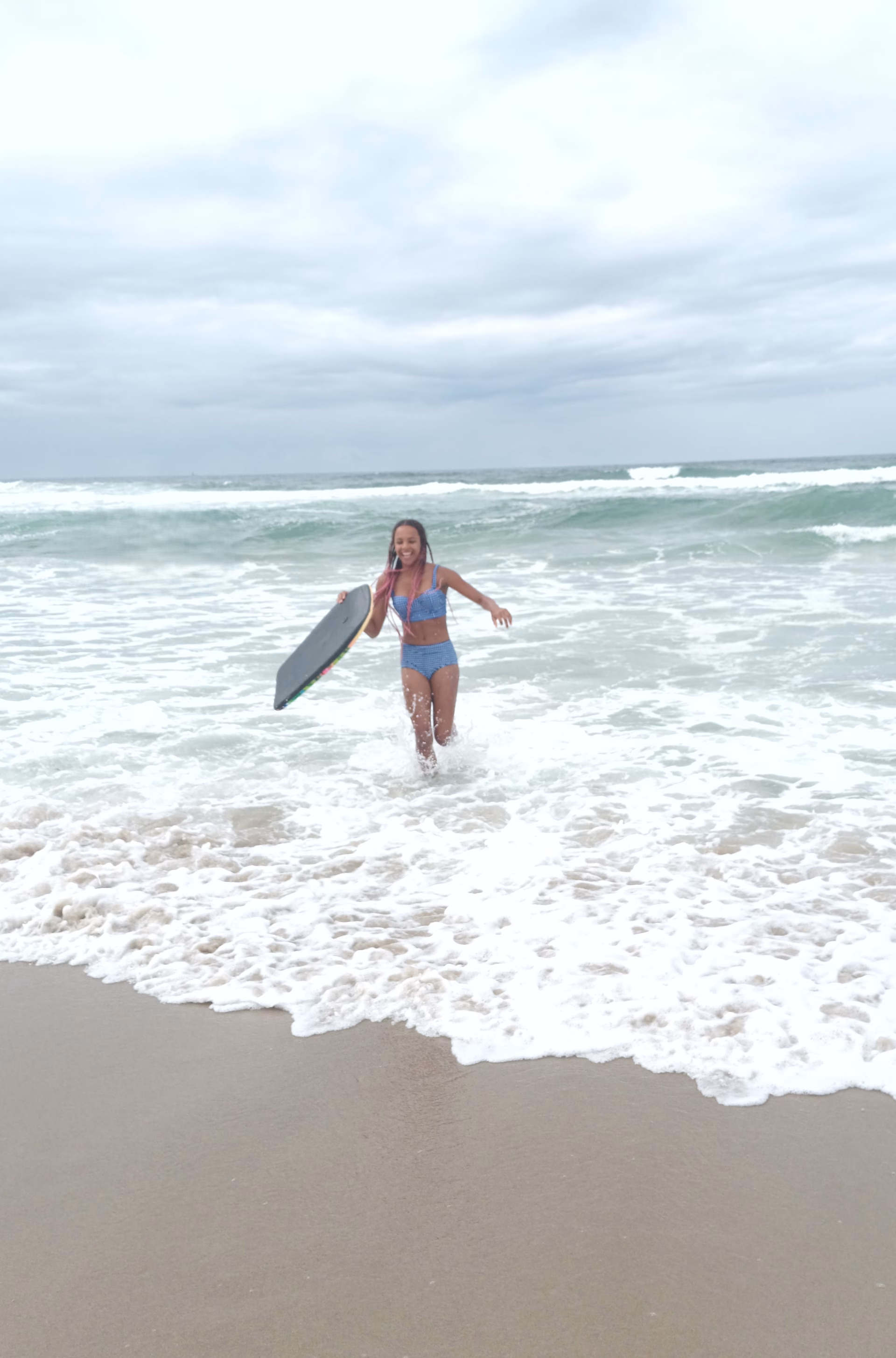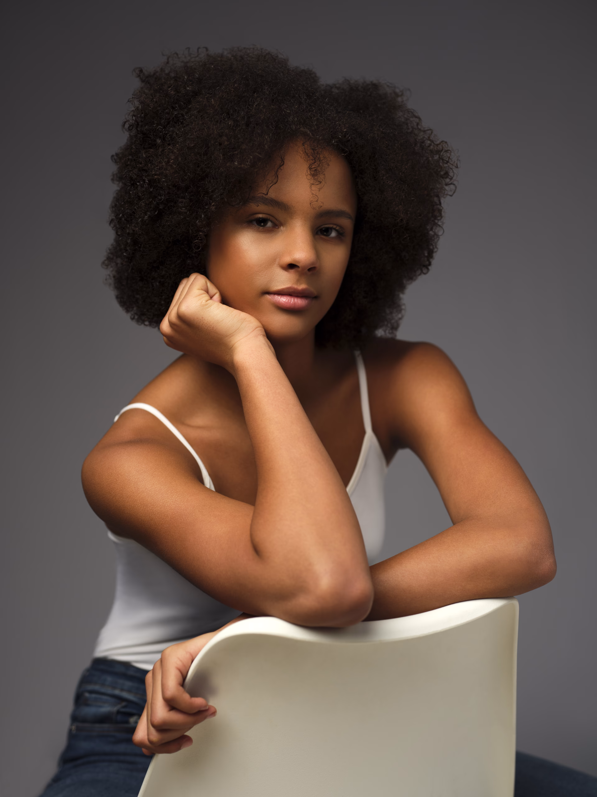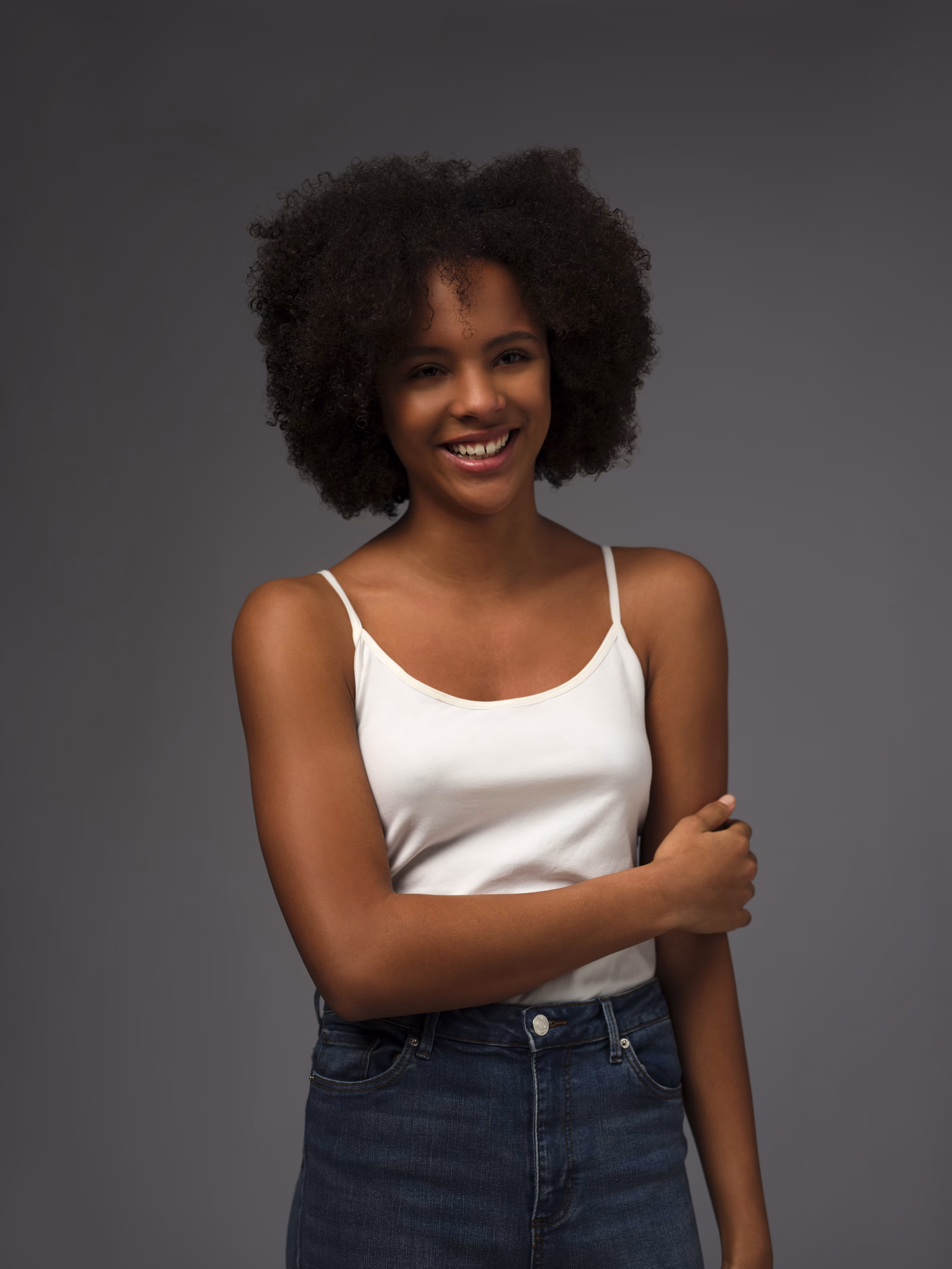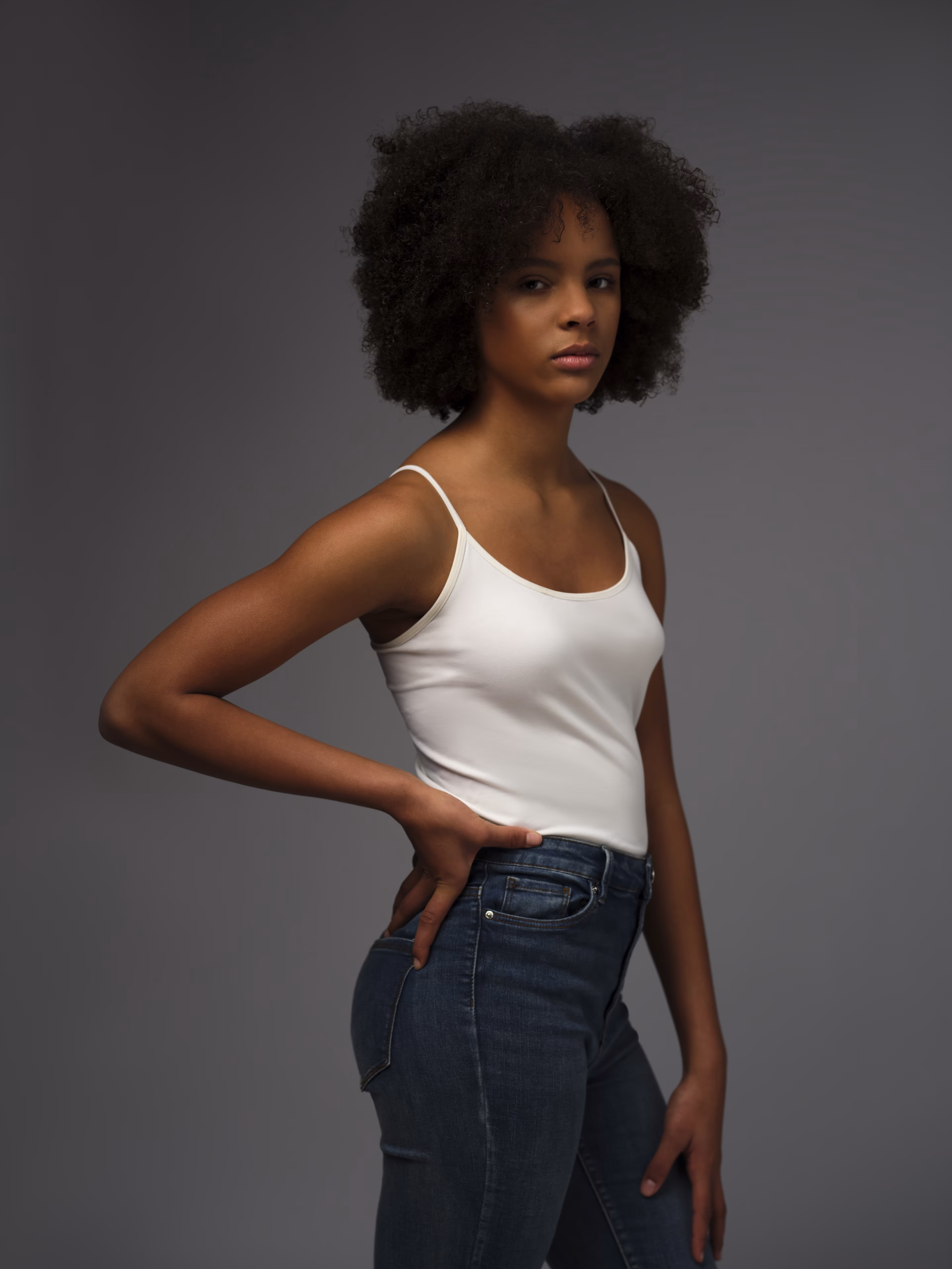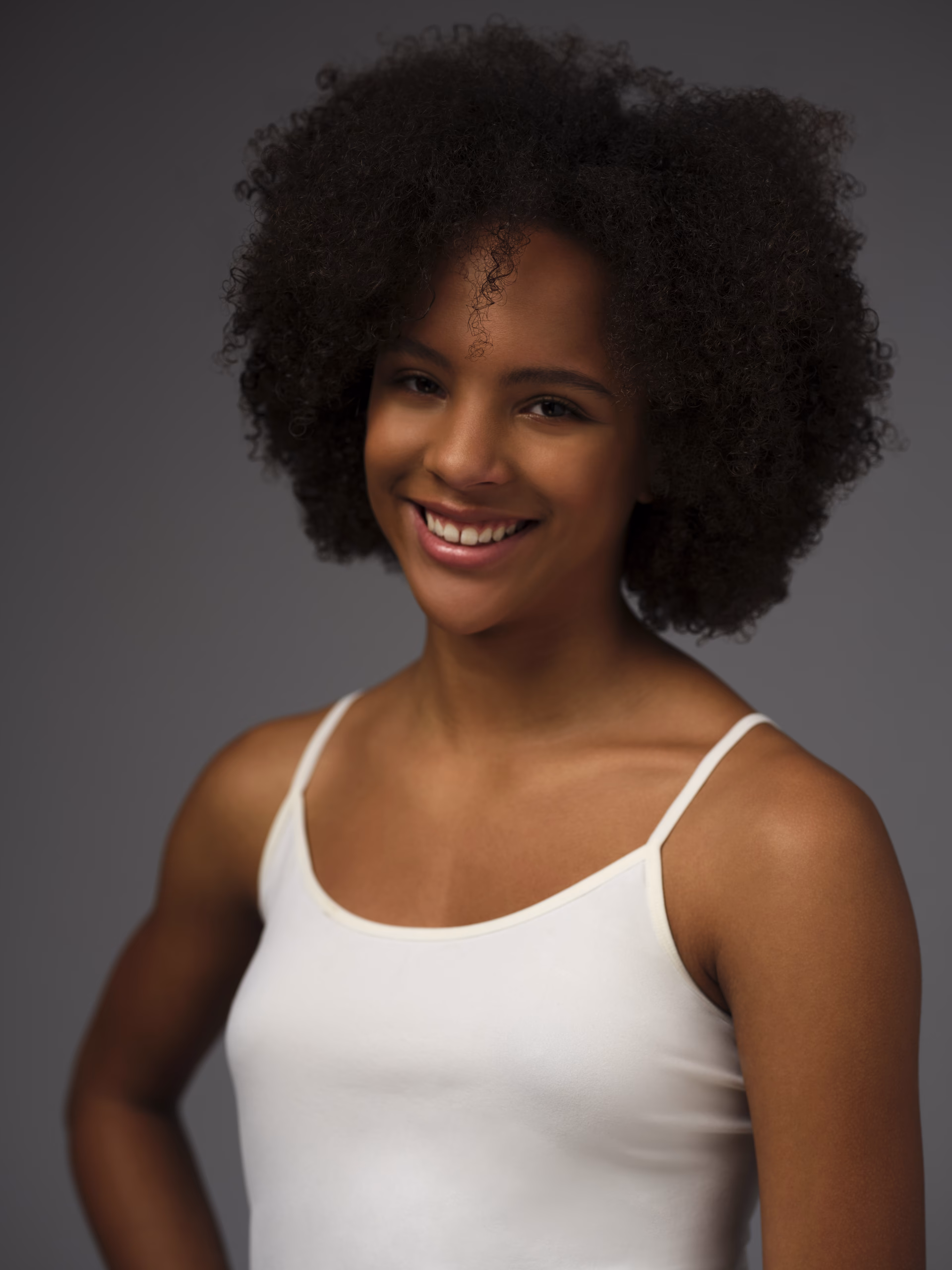 She naturally has small brown curls (type 3C), but unfortunately she hates her afro hair, although photographers and model scouts love it. And therefore she also often wears braids/extensions in various styles (both medium-length and long), and in different colors.