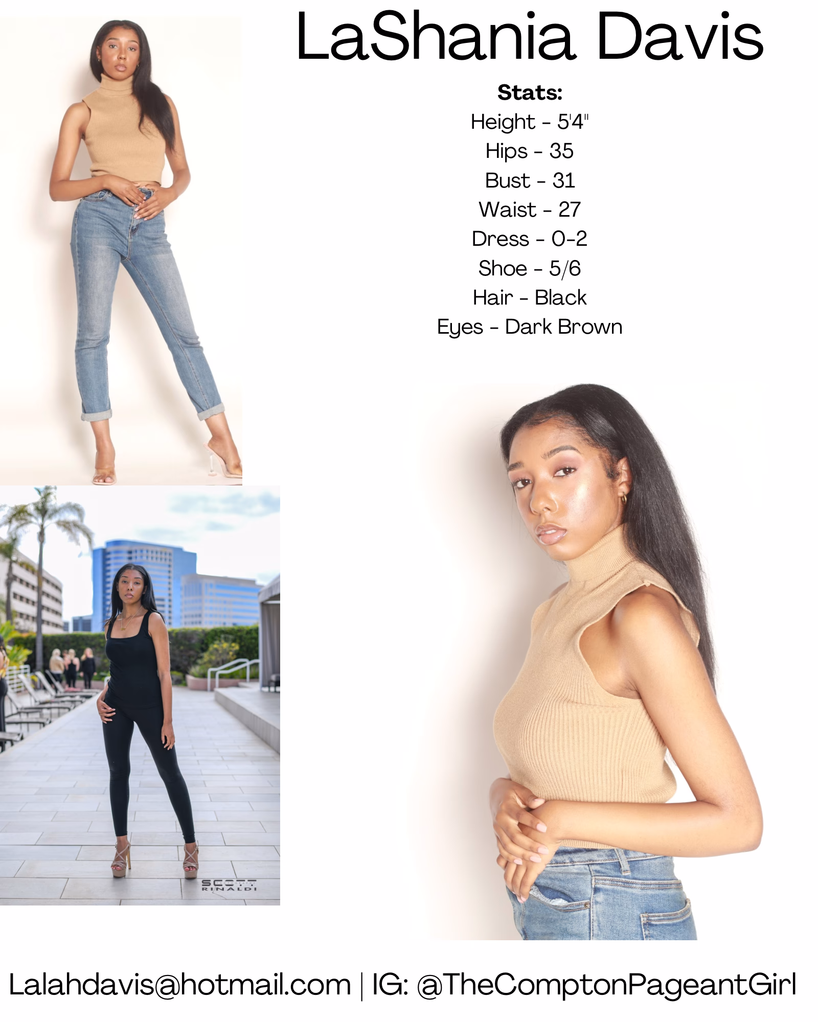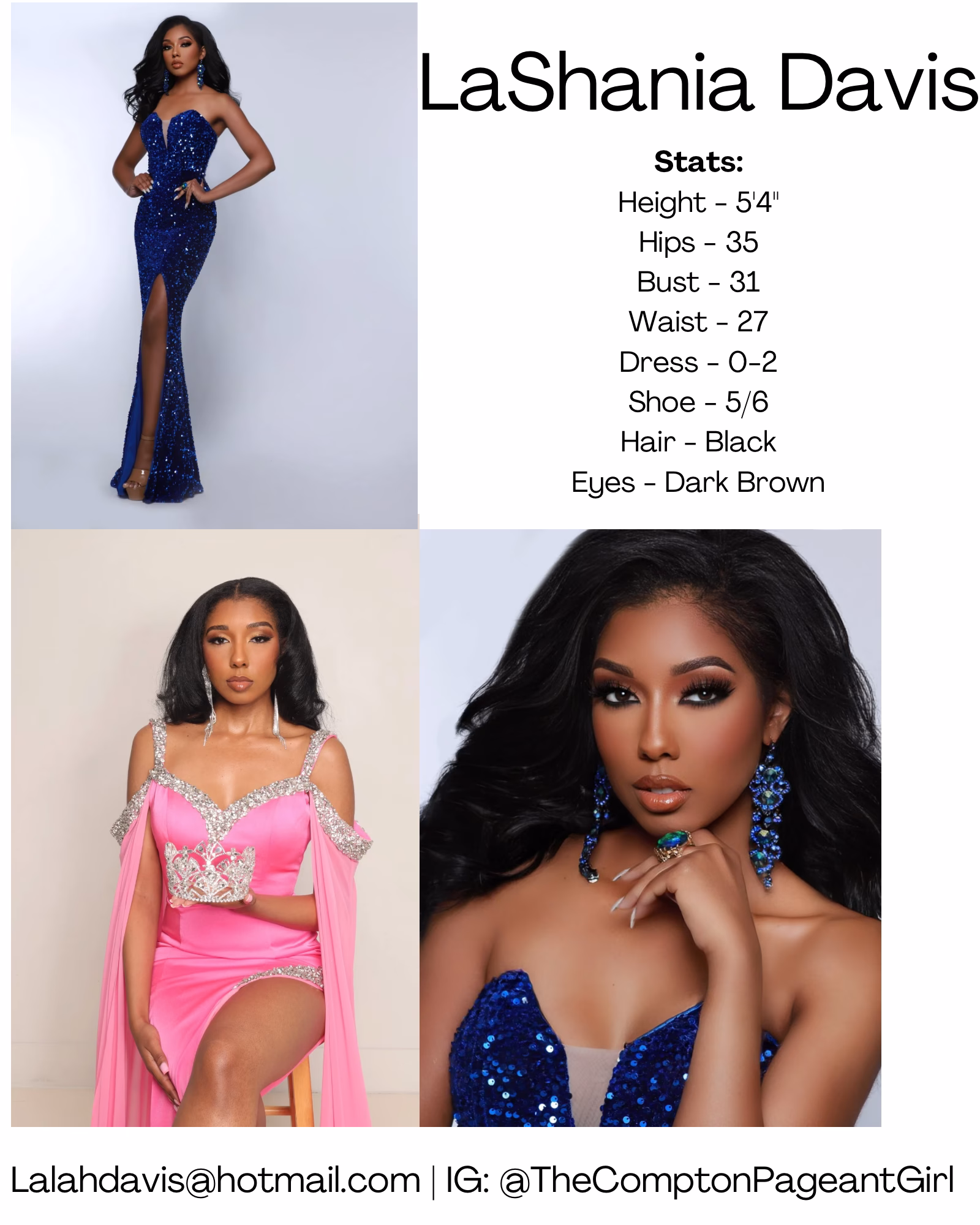 LaShania Davis is a model, media trainer, pageant coach, and three-time pageant titleholder. Known online as "The Compton Pageant Girl" she is a west coast native, who graduated from California State University, Los Angeles with a bachelor's degree in marketing management. Currently, she is a graduate student at Pepperdine University working on her MBA in marketing and a television & film development professional at Hallmark Media. With a goal to encourage women from all backgrounds to enter into pageantry she launched her coaching business, The Pageant Pro, in 2024 for the "new-age woman". She also operates Sister-Sheltering-Sisters, an initiative that educates the public on the pipeline between the risk of being unhoused to becoming homeless. The platform evokes change in the community by distributing both digital and physical resource kits. She aspires to build an empire and continue advocating through her platform in hopes of creating a better tomorrow for women.