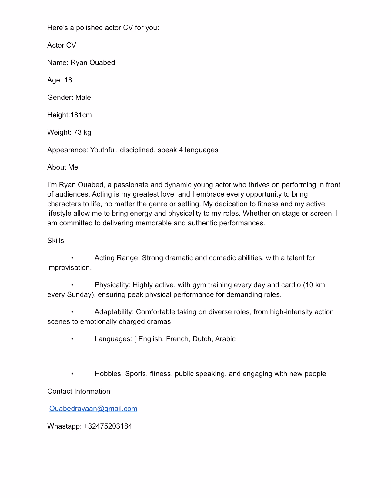 Meet Rayaan Ouabed. Based in Liège, Wallonia, Belgium, this professional brings a range of practical skills and experience to each project. Skilled in Acting, Acting Techniques, Comedy, Communication Skills, Football, Music, Running, Rayaan Ouabed has contributed to a variety of roles, meeting project needs and providing consistent results.