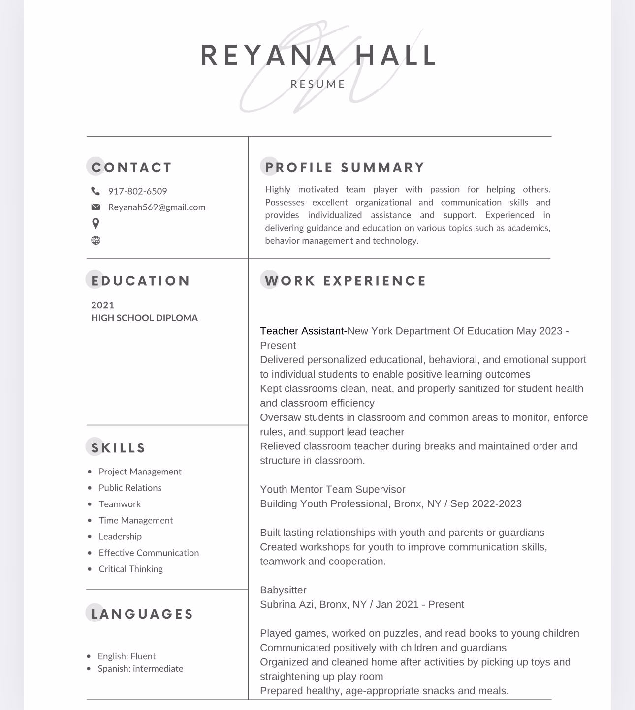 For more details or to discuss potential collaborations, please reach out to explore how Reyana H can contribute to project objectives and support team goals.